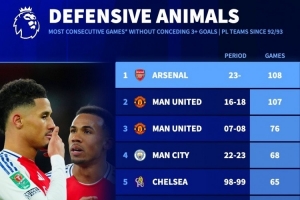 阿森纳连续108场比赛失球少于3粒,创造英超球队纪录