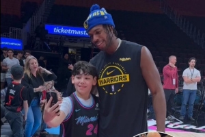 在今天比赛热身间隙,希尔德看到场边一位热火小球迷举着一个牌子,上面写着:“生日愿望是可以和希尔德自拍。”希尔德看到后也很开心的完成了小球迷的生日愿望。