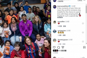 体育资讯12月12日讯 拉什福德参加巴萨基金会活动,与孩子们互动并合影。