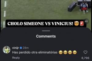 赛后名记罗马诺在个人社媒账号转发了这期冲突的现场视频,而维尼修斯本人也现身评论区,评论道:“(西蒙尼)又输掉一场淘汰赛。”