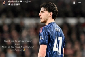 赖斯写道:“感谢随队远征的球迷们! 客场带回一分,接下来全力准备周二的关键战。”